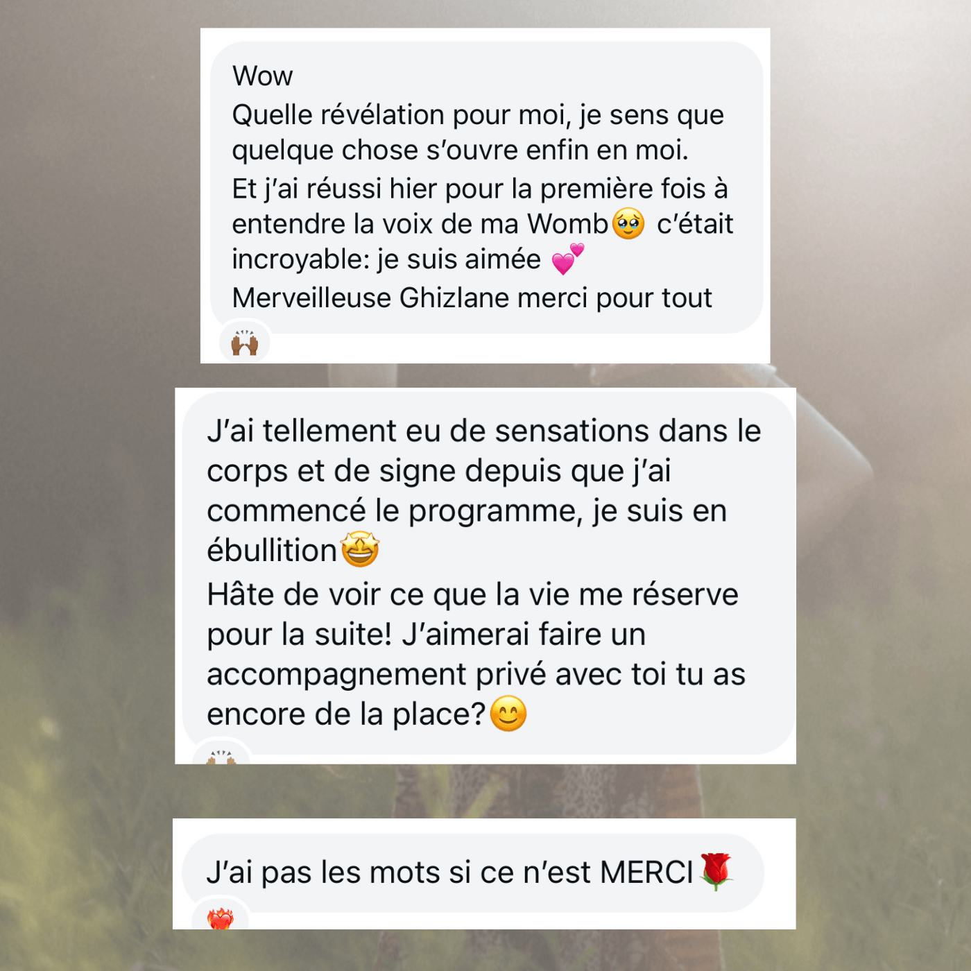 À travers des pratiques de womb healing, womb clearing, explorations somatiques et rituels de self-exploration, tu apprendras à reconnaître et honorer la voix de ton corps.
